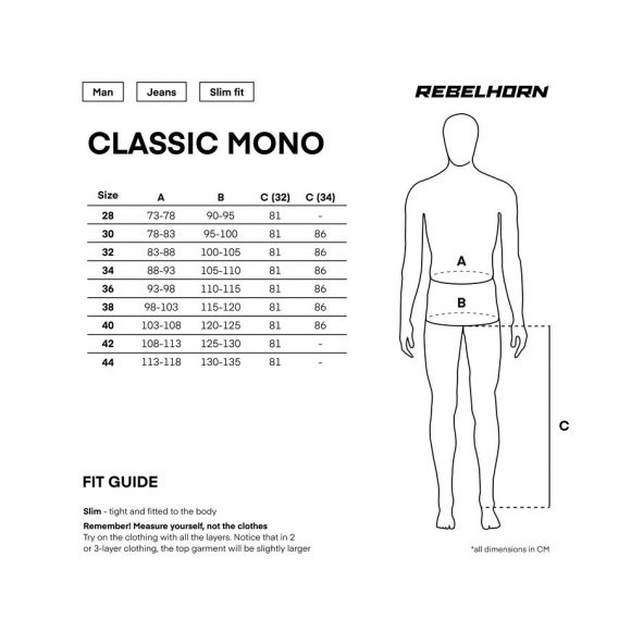 Rebelhorn Classic Mono – Moške enoplastne motoristične kavbojke, ki združujejo videz vsakdanjih hlač z vso varnostjo za motoriste. Rebelhorn Classic Mono je model za motoriste, ki želijo preživeti cel dan na motorju in v mestu, ne da bi morali menjati oblačila. Izdelane so iz zračnega in elastičnega materiala, ki zagotavlja visoko udobje tudi v najbolj vročih dneh, zunanji zadrgi pa omogočajo enostavno odstranjevanje kolenskih ščitnikov po vožnji.