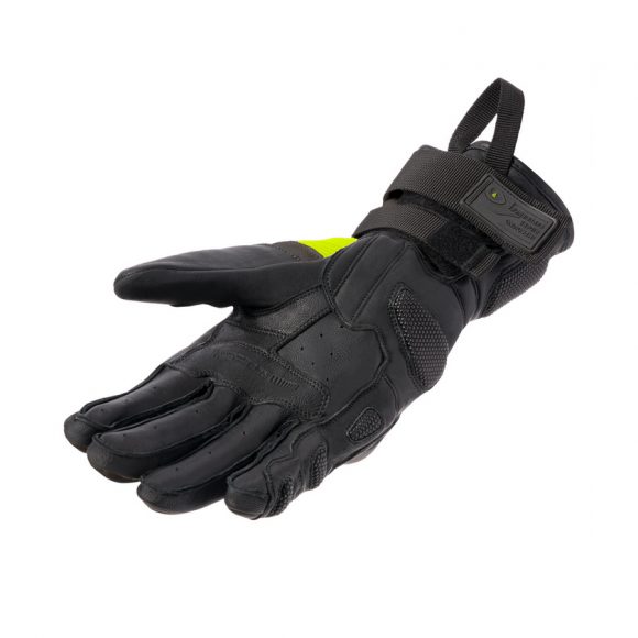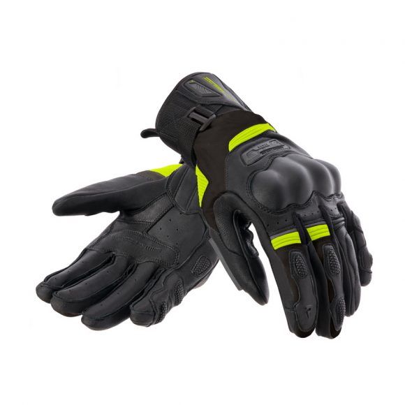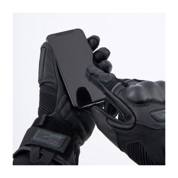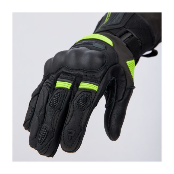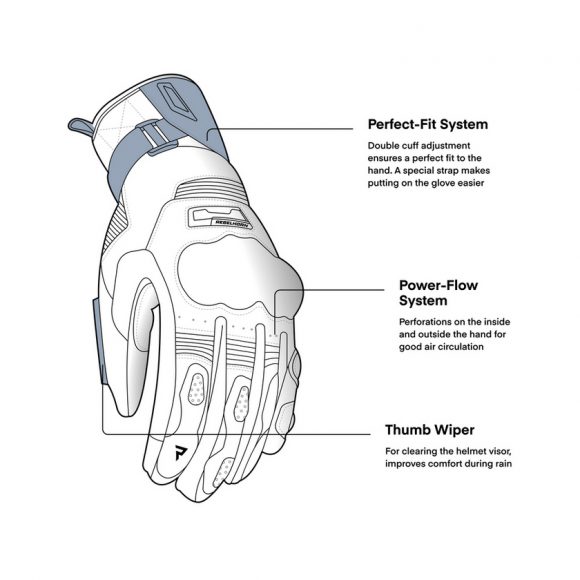 Rebelhorn Range touring motoristične rokavice so opremljene z mehko zaščito členkov SAS-TEC® ter vložki za blaženje udarcev na notranji strani in manšeti. Spodnja stran rokavice je ojačana s Superfabric® in dodatno plastjo usnja za zaščito. Brisalec palca izboljša udobje pri vožnji v dežju, posebne plošče pa omogočajo upravljanje zaslona na dotik brez snemanja rokavic.