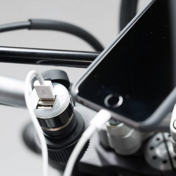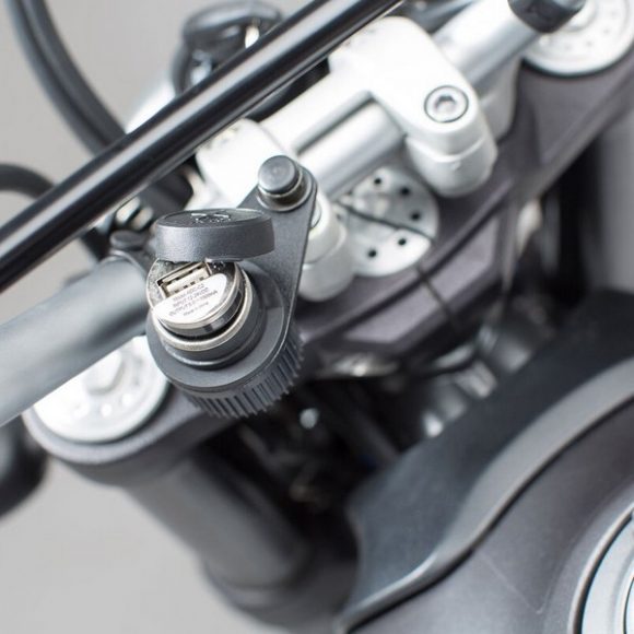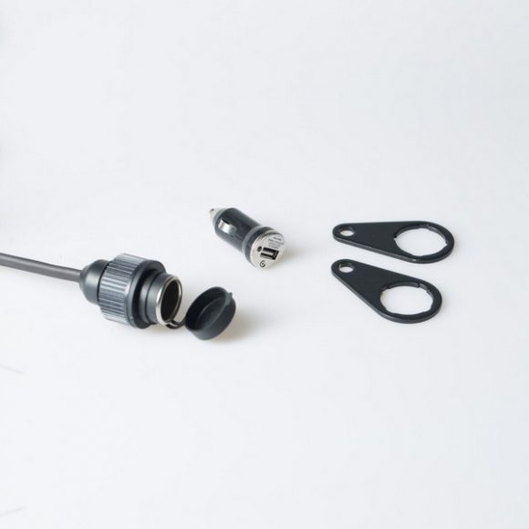 12v vtičnica za vžigalnik se neposredno poveže z napajalnim sistemom motorja. S priloženim USB adapterjem lahko napolnite svoj telefon ali GPS napravo. Priložen nosilec lahko pritrdite na skoraj vsako krmilo z vijaki M8 in M10. Alternativno lahko vtičnico namestite na ohišje motornega kolesa.