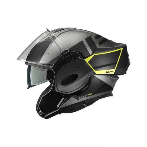Flip-back preklopna motoristična čelada z notranjim sončnim vizirjem.