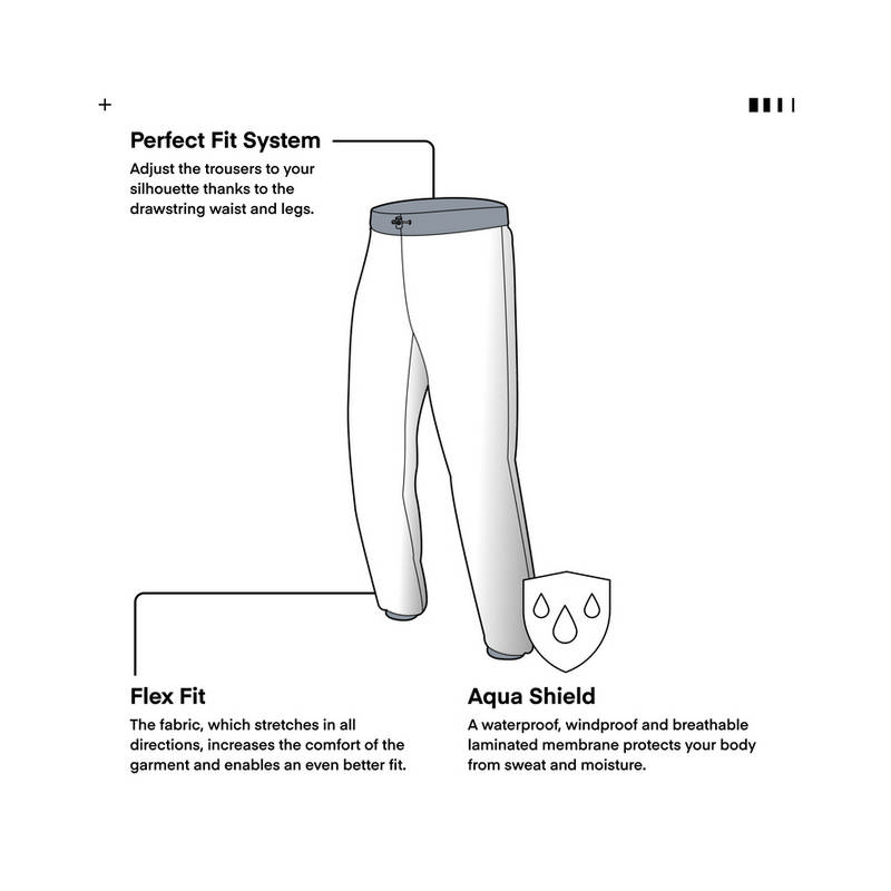 Rebelhorn Ocean dežne hlače so izdelane iz elastičnega materiala za optimalno prileganje in udobje. Popolnoma nepremočljive in odporne na veter. Material omogoča dihanje in se obnese odlično v vseh vremenskih pogojih.Vodni stolpec do 8000mm/m2, odporno na veter in omogoča dihanje do 2000g/m2 s pomočjo laminirane membrane.